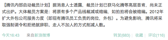 Someone broke on Sina Weibo today that Chinese Internet giant Tencent will be downsizing headcount in next year through scaling down and discontinuing product lines, the plan was nodded by Pony Ma, founder and CEO of Tencent.