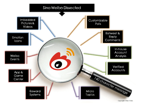 Let’s begin with the basics, and take a look at the infographic below. It sums up all the features a brand or company can harness to captivate, engage and grow a targeted community on Sina’s microblog.
