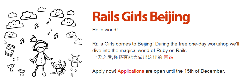 To encourage more female entrepreneur’s to get a piece of the start-up action in China, Rails Girls Beijing is holding a class on Saturday December 15th to teach them how to code in Ruby on Rails for free. Be quick though, sign up applications close on Friday December 14th. You can sign up here in Chinese or here in English.