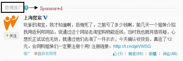 It is found that paid posts, labeled as “sponsored”, appeared in the news feed of Sina Weibo today, which is long-awaited as its management mentioned it long time ago. It’s a self-serve system that is open to any user, not limited to businesses, as described by its CEO, Charles Chao, on the latest earnings conference call. No such posts found in the news feed of the mobile versions, so far.