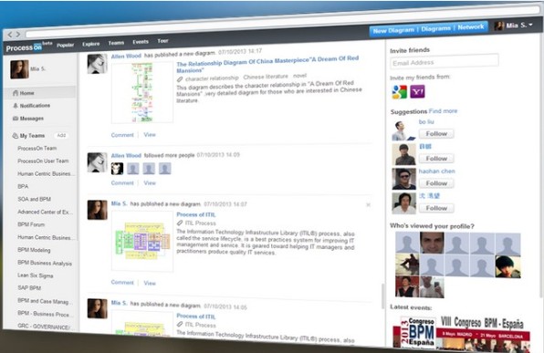The social network feature allows users to follow people, follow tags, update info, ratings and add comments to diagrams, etc. By rating and commenting, you can increase the value of diagram and help other users to find best diagram easily. Visitors can filter diagrams by ratings, time and comments for easy use. In addition, there is also option to search diagrams by owners and tags. It will also notify you when other people follows your update or diagram. On the whole, ProcessOn is really best online tool to create diagrams collaboratively. In the near future, the site will also replace the current traditional drawing tool.