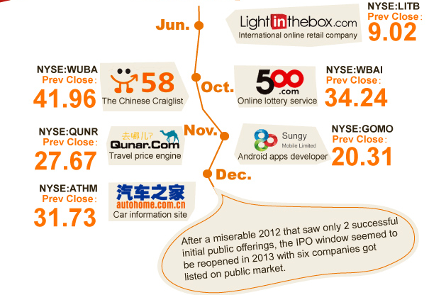 I’ll start with the not so bad part. Just so you know, 2012 was a dud for both the startup and venture capital world with only two startups made it to the public market — YY(NASDAQ:YY) and VIPShop(NYSE:VIPS). The gloomy picture was mostly painted by the sustained worldwide economic downturn and worries over accounting fraud that dogged and derailed several China concept stocks over the past two years. Now in 2013 that picture – which apparently was put upside down — turned around and turned out to be a masterpiece. We have six companies, including 58(NYSE:WUBA), 500Wan(NYSE:WBAI), AutoHome(NYSE:ATHM), Lightinthebox(NYSE:LITB), SUNGYMobile(NASDAQ:GOMO) and Qunar(NASDAQ:QUNR), successfully pulled off long-awaited IPO.