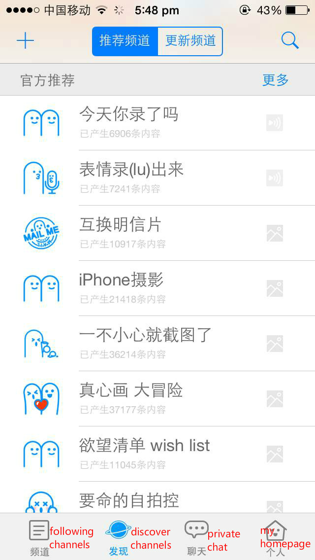 The startup claims to be an original homegrown social network, defying lazy stereotypes of Copy2China. A same engineer recently revealed same‘s “high rate of return” on Zhihu, China’s Quora equivalence. The secret behind the sticky user base, he suggests, is gamifying the app. Gamification is manifested by the variety of channel types such as text, image, music, movie, voting, “punch-the-clock”, and the fact that anyone can set up their own channel with a designated rule/theme.