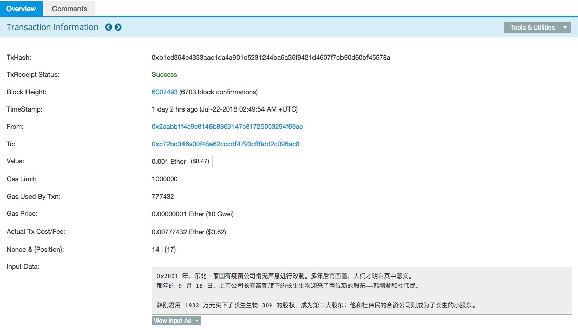 Transaction records for the cryptoasset show that on July 22, an Ethereum address sent a value of 0.001 Ethereum to itself. The metadata to the transaction contained the text of the post. Since Ethereum transaction records are public, the post can be read by anyone.
